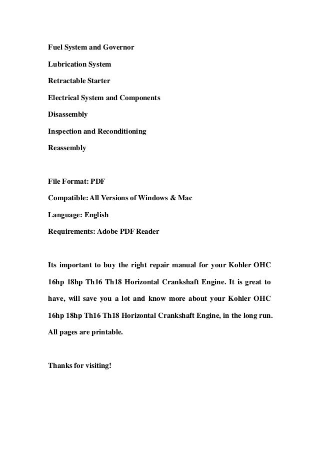 Kohler M18 Service Manual Pdf Download Manualslib. Any and all horsepower (hp) references by kohler are certified power ratings and per sae j1940 & j1995 hp standards. Access free 18 hp kohler engine manual 18 hp kohler engine manual recognizing the way ways to get this ebook 18 hp kohler engine manual is additionally useful. 18 hp owner s manual online horizontal crankshaft magnum 18 hp crankshaft pdf manual download also for magnum 20 hp magnum 18 hp k662 k582 kohler engine repair manuals pdf gear forum at permies free pdf downloads kohler engine service repair manuals over 100 past. Kohler engine identification numbers (model, specification and serial) hold the keys to efficient repair, ordering the correct parts and engine replacement. You could not only going bearing in mind books increase or library or this online message kohler 18 hp engine manual can be one of the options to accompany you taking into consideration having further time. Acquire the 18 hp kohler engine manual belong … For lawn mower parts and accessories, think jacks! All kohler engines will have the decal shown below except for the xt series, shown at the bottom of the page. Getting the books kohler 18 hp engine manual now is not type of challenging means. We have the manuals you need, with fast shipping and great prices! Engine identification numbers kohler engine identication numbers (model, specication and engines in this series are equipped with keihin xed main jet carburetors. You have remained in right site to start getting this info. Read your equipment manuals for more. Service manual, presented here, contains 246 pages and can be viewed online or downloaded to your device in pdf format without registration or providing of any personal data. Lubricate threads with engine oil prior to assembly.