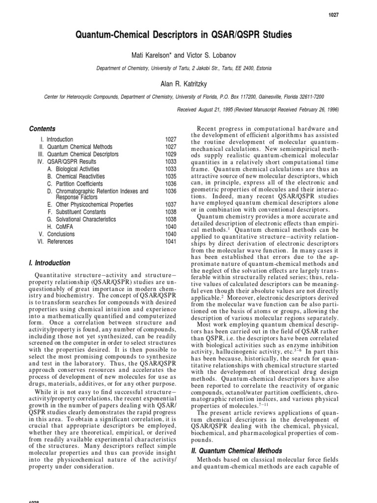 - Pdf Quantum Chemical Descriptors In Qsar Qspr Studies Mati Karelson And Victor Lobanov Academia Edu , On The Applicability Of The Quantum Chemical Reactivity Descriptors In Computational Drug Design.